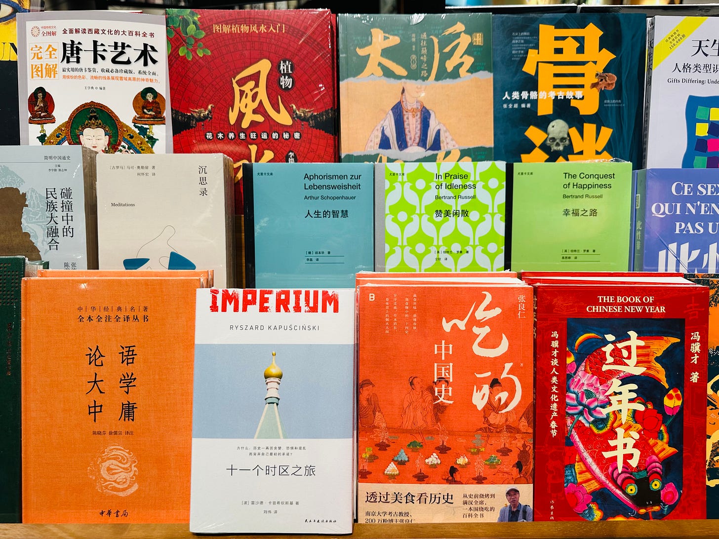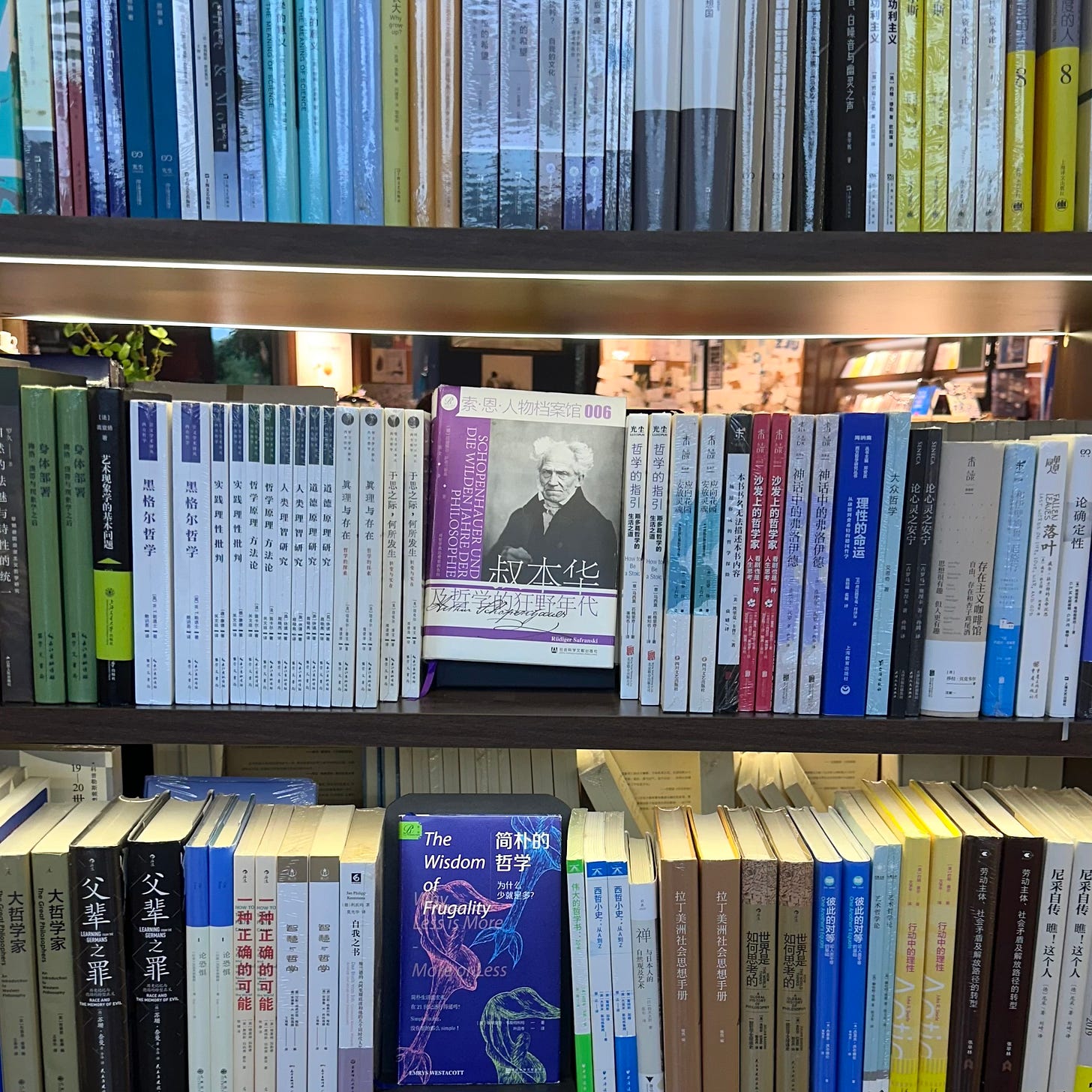 Exhibit A is a photo I took at Sisyphus Bookstore in Hangzhou. Schopenhauer is nested between Russell’s In Praise of Idleness and The Conquest of Happiness on one side, and Marcus Aurelius’s Meditations on the other—some perennial favorites among Chinese readers