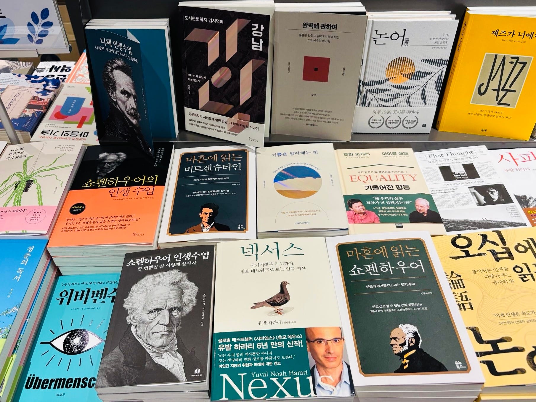 Exhibit C is from Youngpoong bookstore in Seoul. Schopenhauer makes three appearances on the feature table—his biography, Aphorisms on Practical Wisdom, and a 2023 Korean title, Reading Schopenhauer at Forty, written by Kang Yong-soo, a philosophy professor at Korea University. To the surprise of its author, the book became a massive bestseller, topping the charts at major Korean bookstores through late 2023 and most of 2024—the first philosophy title in memory to do so. It sparked what the press called a “Schopenhauer fever.” K-pop stars—many well under forty—rushed to endorse it. It appeared in an entertainment series. A dozen other Schopenhauer titles also crowd the shelves.