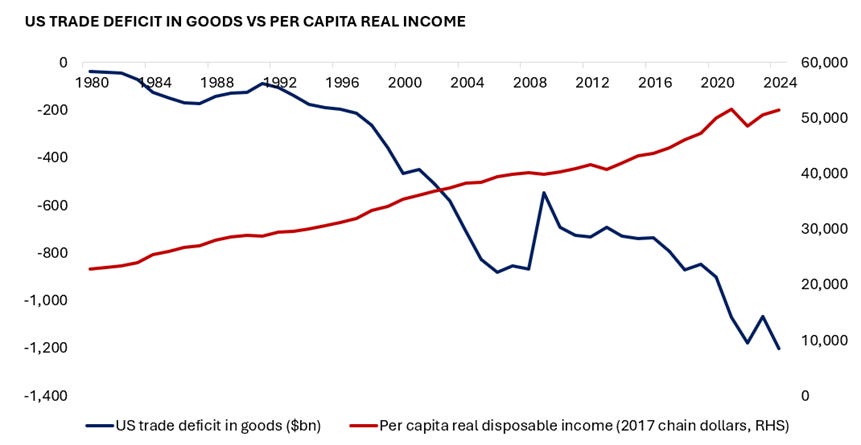 The Court of Economic Common Sense is aware that as the size of the US trade deficit has increased, per capita real income has continued to rise.