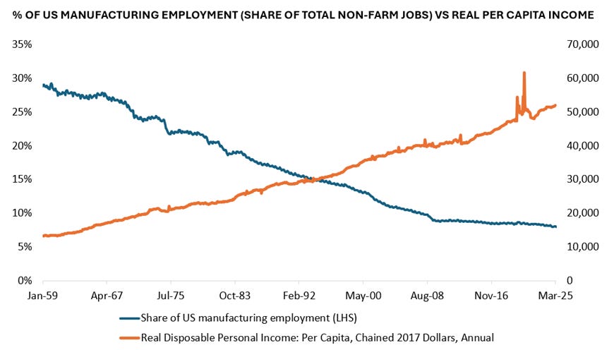 The chief justice also understands that real per capita income in the US has continued to rise despite a steady decline in the manufacturing share of total non-farm employment. (Service sector wages are, on average, now higher than wages for workers in manufacturing.)