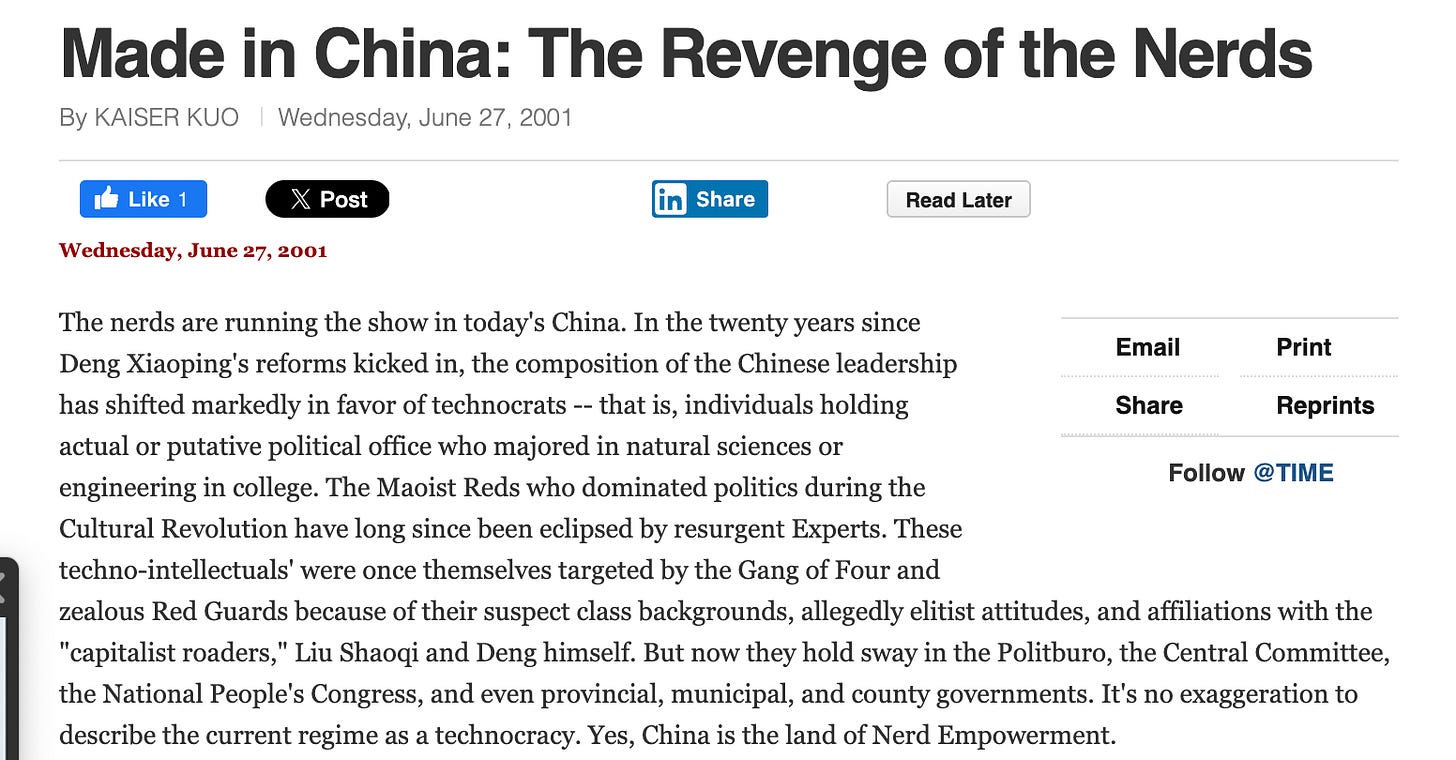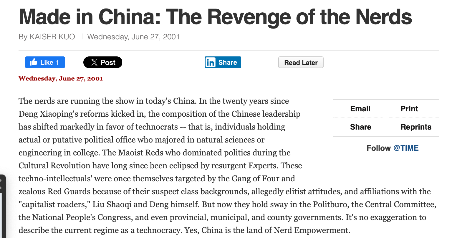 In the early 2000s, I briefly had a column in Time Magazine, primarily featured in its Asia edition, titled “Made in China.” With Dan Wang’s new book making quite a buzz, I thought it might be time to run this particular essay, which I knew even then was the nail in the coffin of my unfinished Ph.D., which was going to be about the rise of technocrats in post-Mao China. Thus “Time Capsule.” See what I did there? Link to the original piece, unedited below, can be found here.